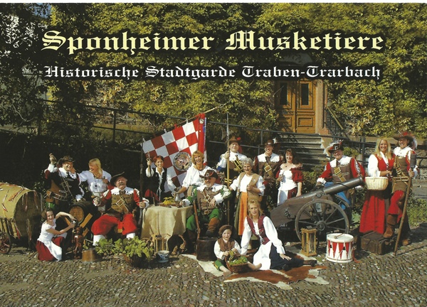 Sponheimer Musketiere Historische Stadtgarde Traben-Trabach Die Sponheimer Musketiere sind ein "Bunter Haufen" der Wein, Region und unsere Landschaft liebt und verteidigt. Moselrepräsentanten auf Umzügen und anderen Traditionsveranstaltungen.
